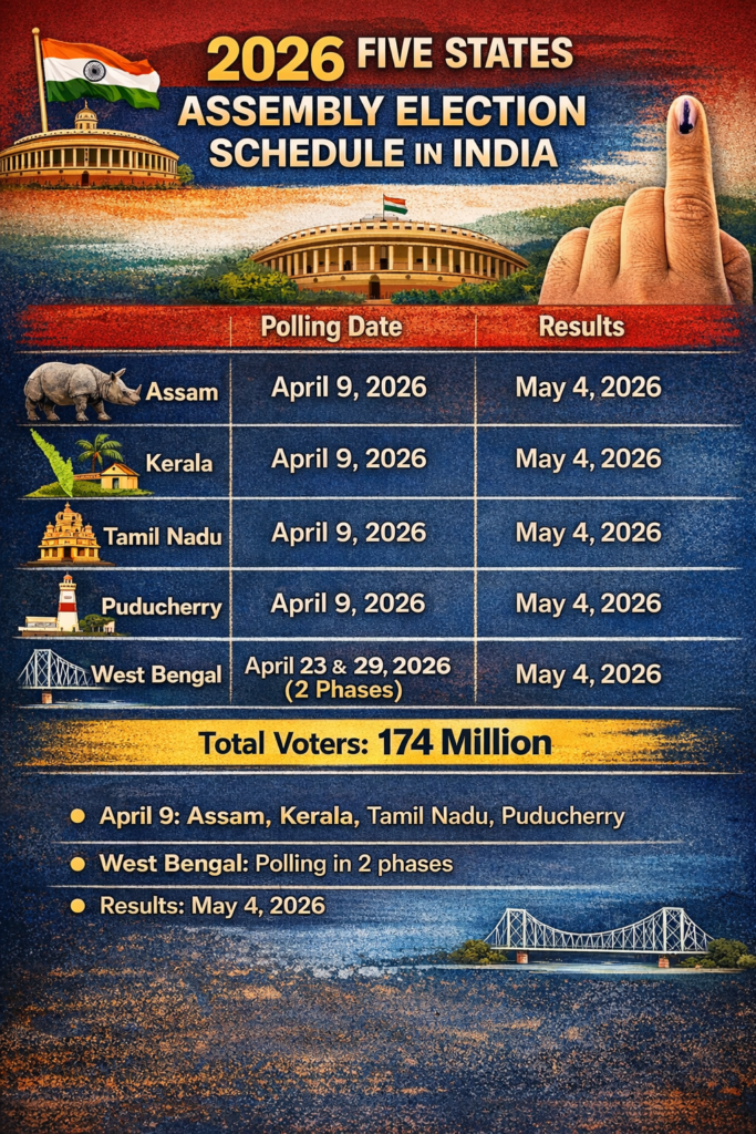 ఎన్నికల షెడ్యూల్ ప్రకారం, Assam, Kerala, Tamil Nadu మరియు Puducherryలో ఏప్రిల్ 9, 2026న పోలింగ్ జరుగుతుంది. అదే సమయంలో West Bengalలో ఏప్రిల్ 23 మరియు ఏప్రిల్ 29 తేదీల్లో రెండు దశల్లో ఓటింగ్ నిర్వహించనున్నారు. అన్ని రాష్ట్రాల ఓట్ల లెక్కింపు మే 4, 2026న జరగనుంది.